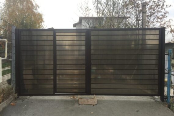 Porti auto batante cu pietonala inclusaContur rama din teava 60x40mmBete orizontale din teava 20x20mm cu distanta 120mm intre eleStalpi 100x100mmPolicarbonat 6mm fumuriu