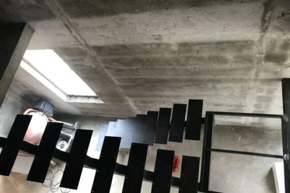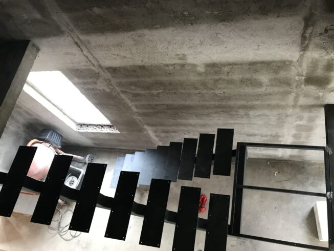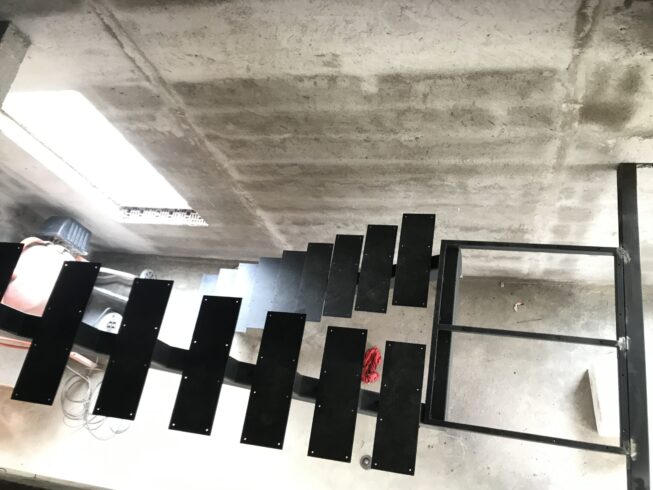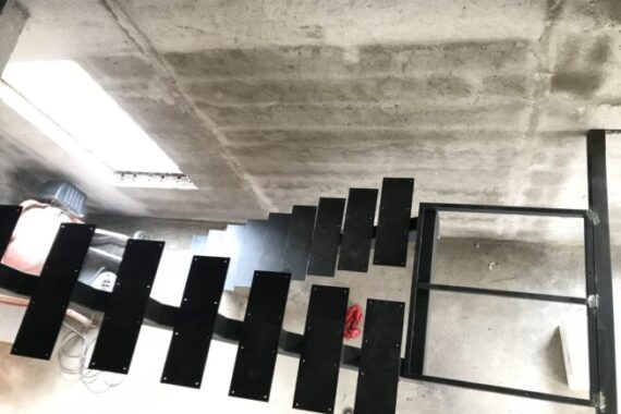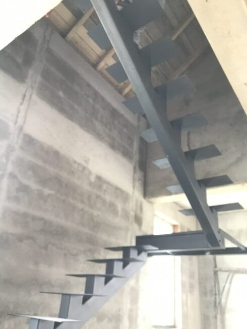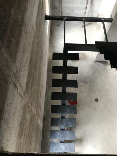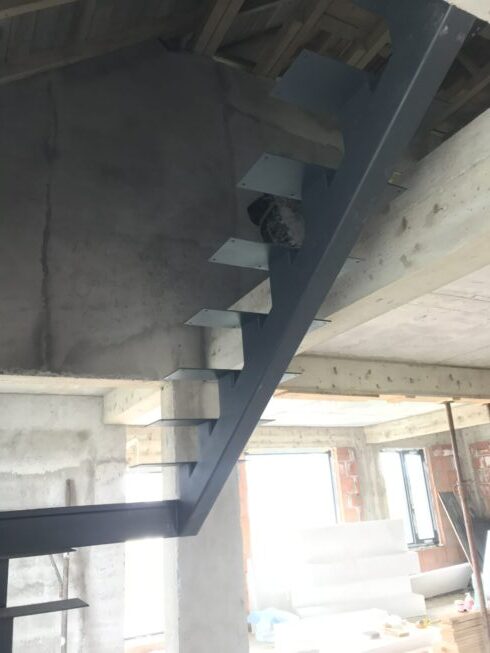 Scara de interior cu vang central , rotire de 180 grade si podest de odihnaTeava 100x150mm pentru vangTrepte din tabla groasa de 8mm pregaurita pentru montaj lemn