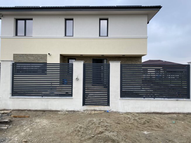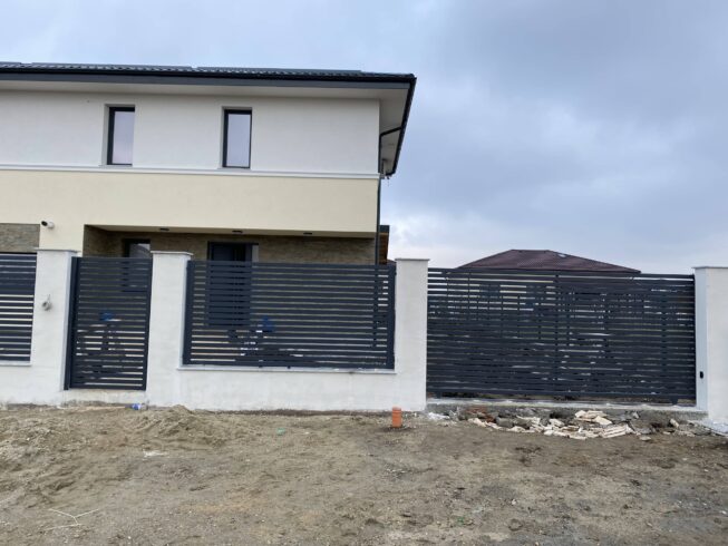 Poarta auto culisanta 5 x 2m cu automatizarePoarta pietonala 1.2 x 2mPanouri de gardRama contur teava 60x40mmBete orizontale teava 60x20mm cu o distanta de 20 mm intre bete